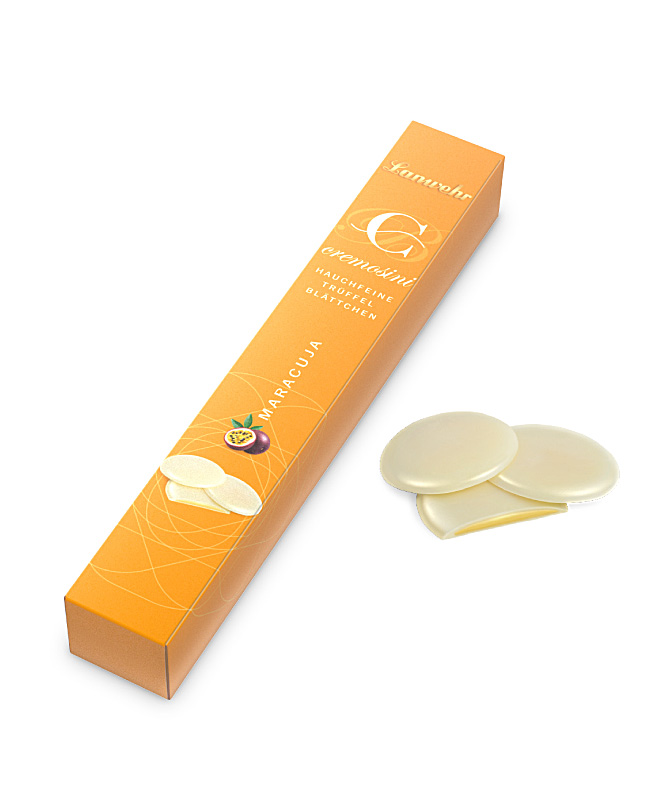 Hauchdünnes Schokoladenblättchen aus weißer Schokolade, gefüllt mit einer säuerlich fruchtigen Maracujatrüffelcreme. 100 g
