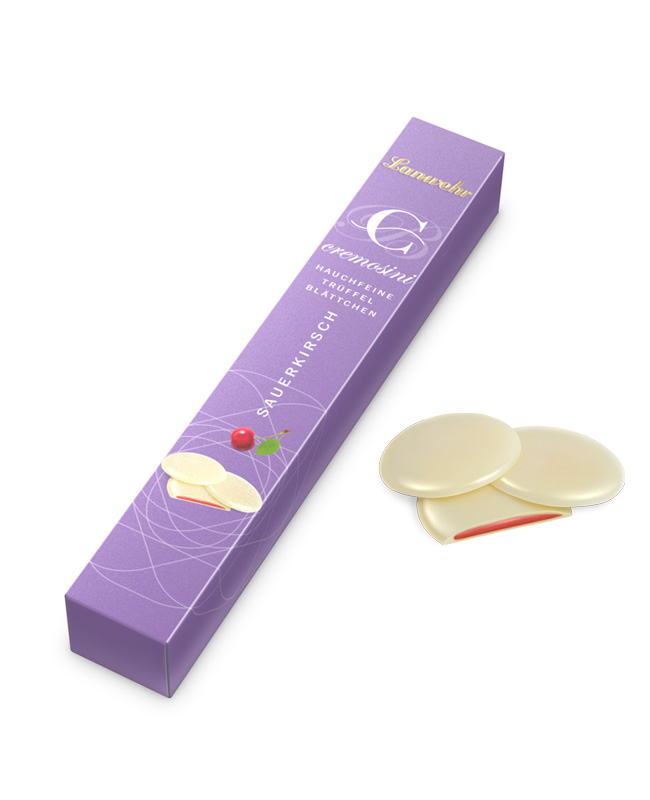 Hauchdünnes Schokoladenblättchen aus weißer Schokolade, gefüllt mit einer fruchtigen, erfrischenden Sauerkirschtrüffelcreme.